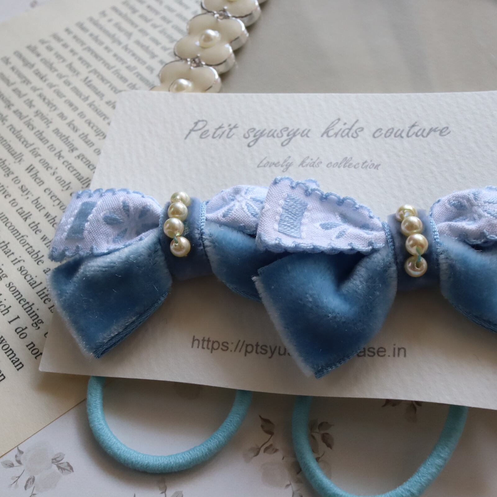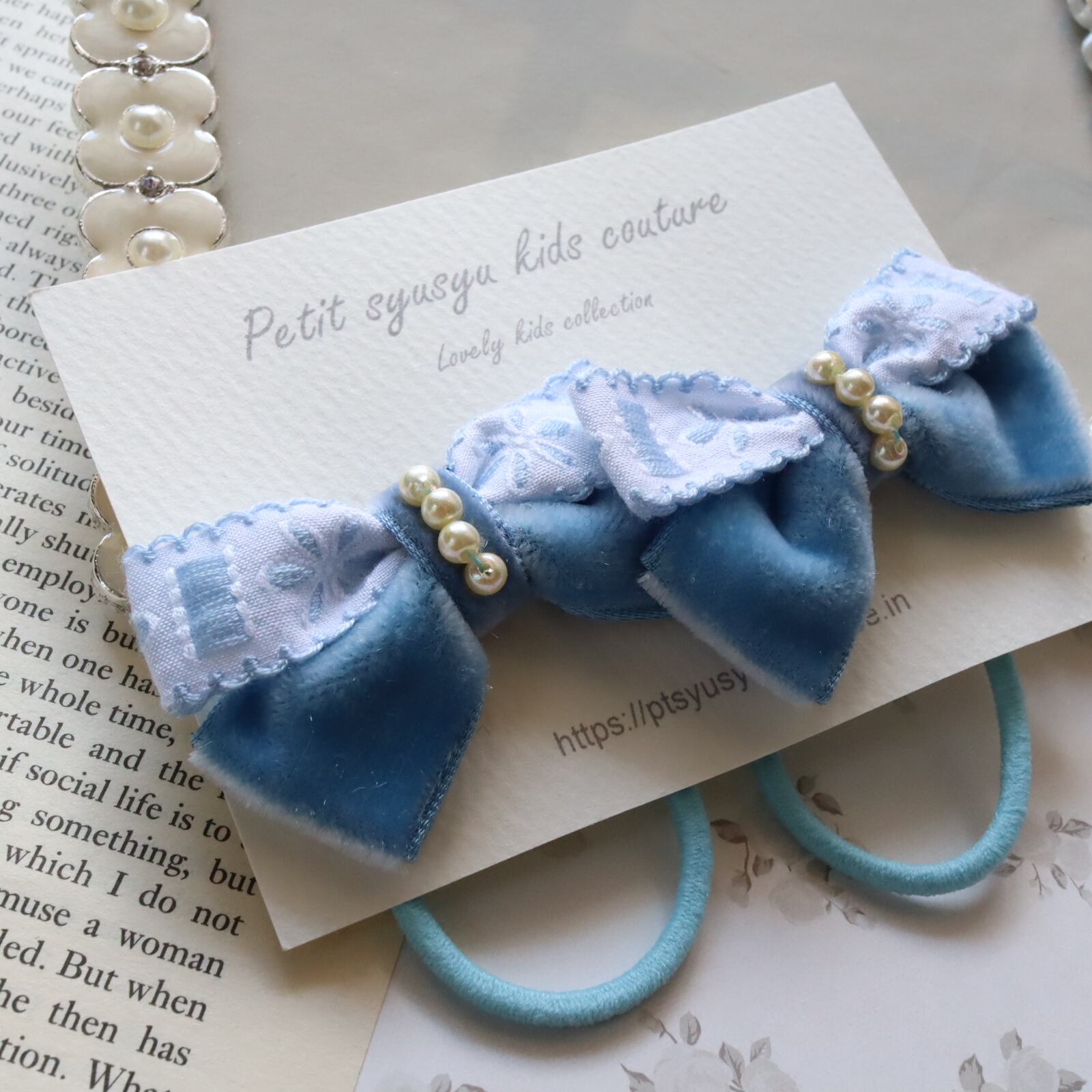 ベルベットとパールのモチーフがかわいいヘアゴムです。