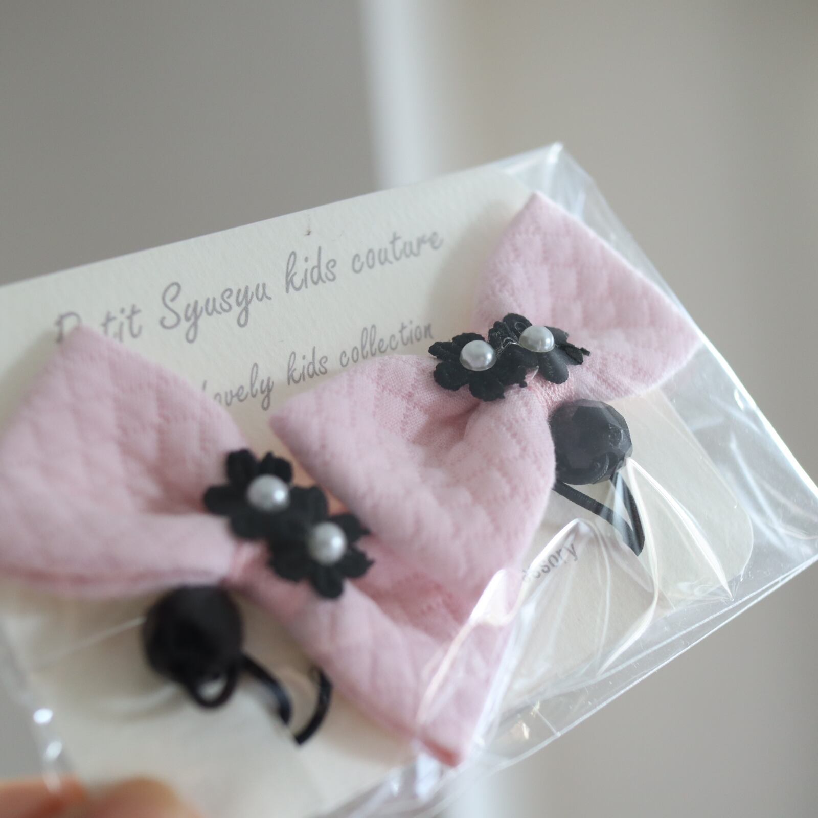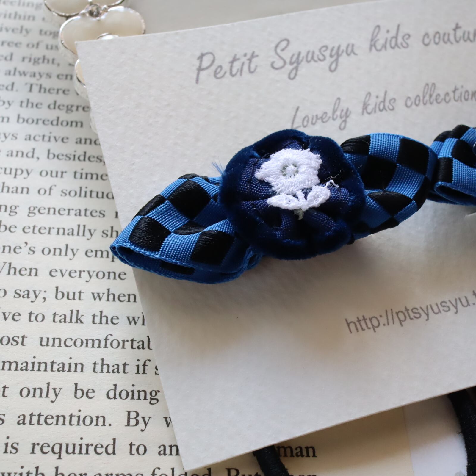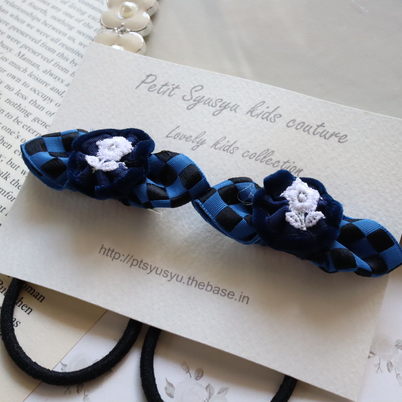 お花のモチーフと格子の組み合わせがかわいいヘアゴムです。