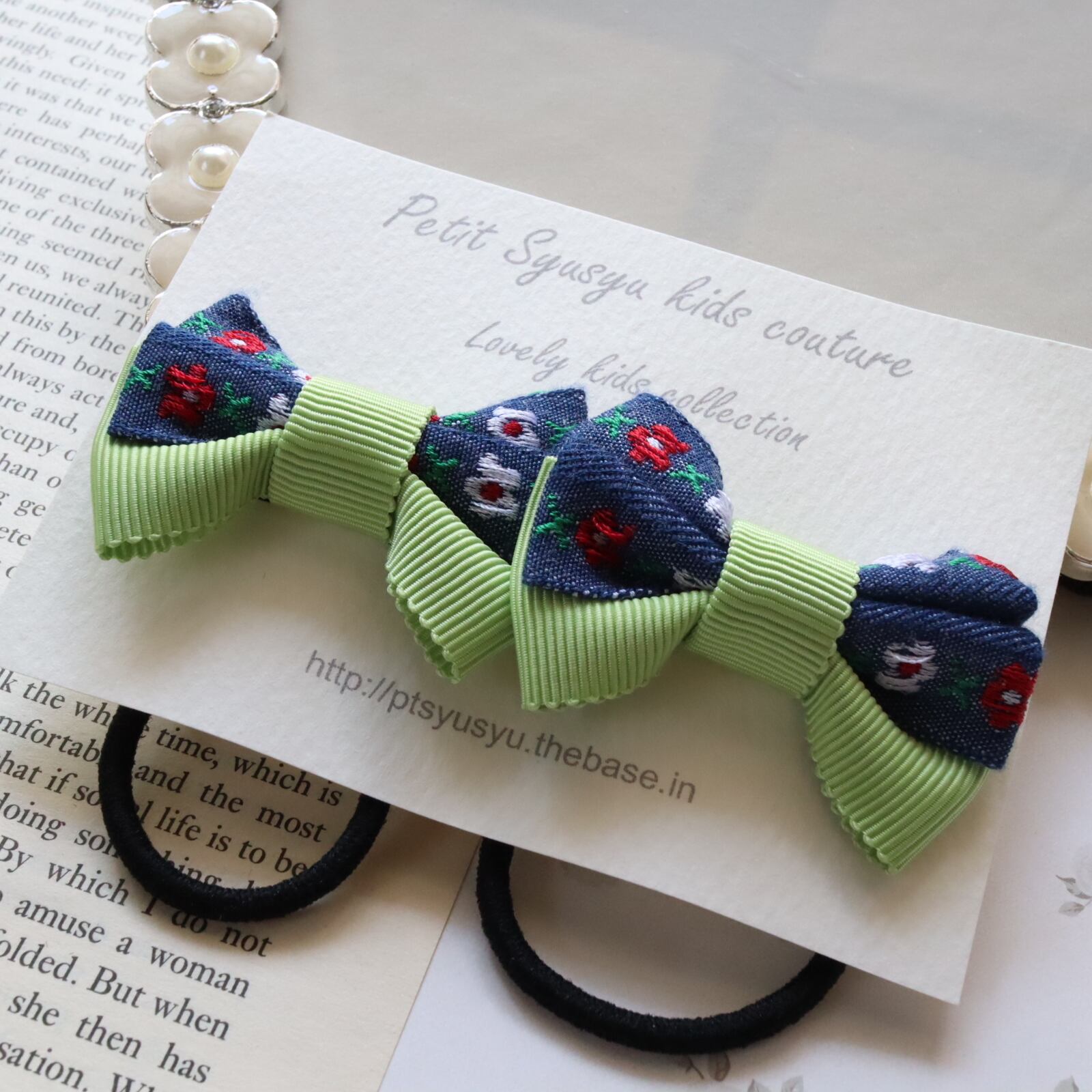 デニムの生地に花柄がプチプチついたSサイズのポニーゴムです。