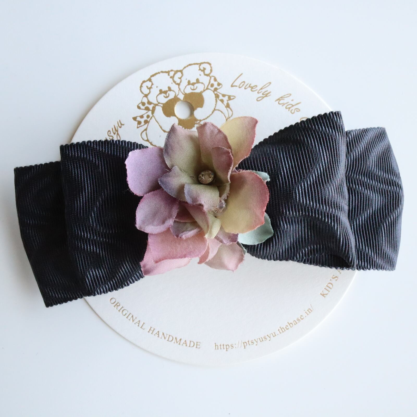 キッズ用の可愛いバレッタです。 グレーのおリボンにお花が付いています。 大人っぽい雰囲気になります。 発表会や結婚式や七五三のヘアアレンジとしてもお使い頂けます。