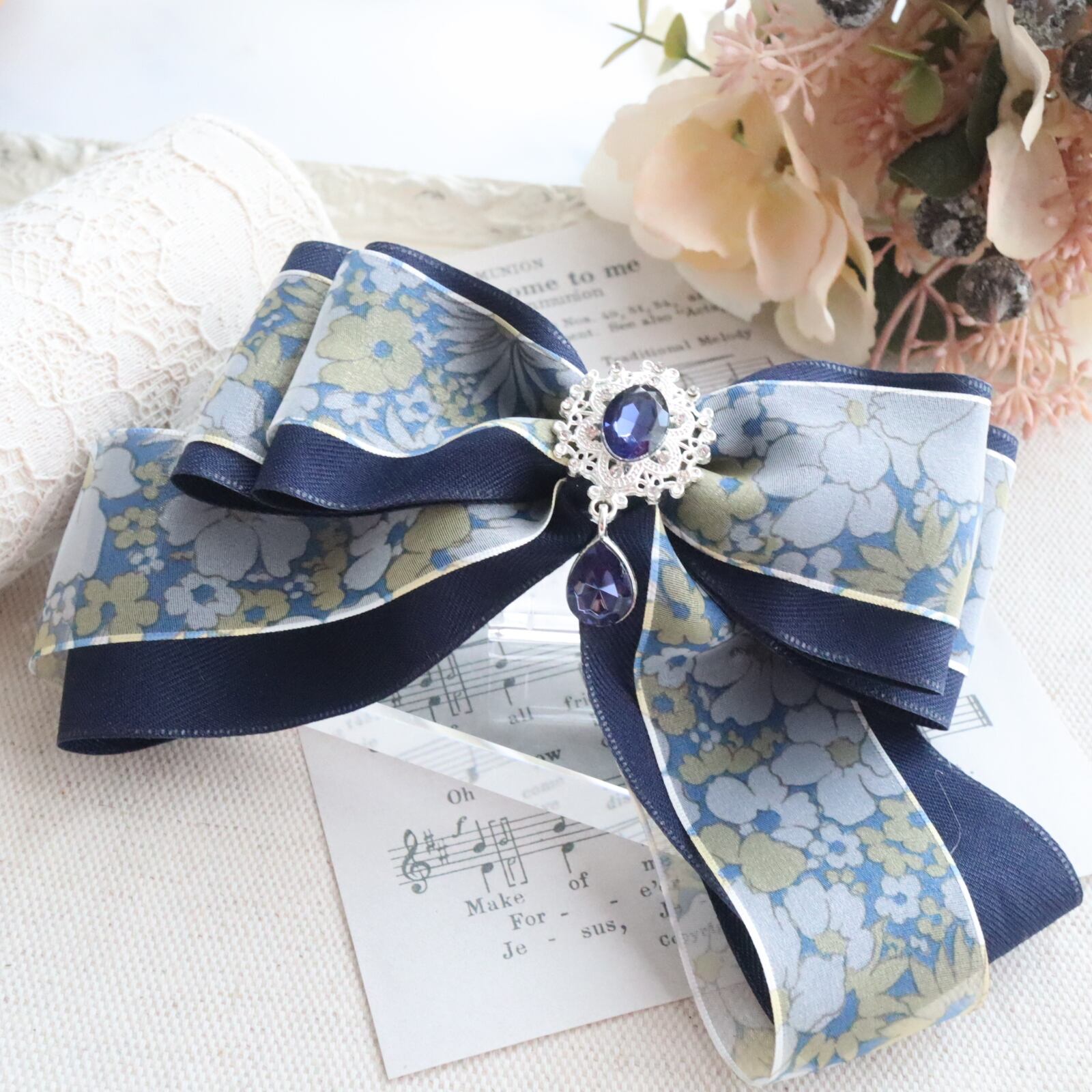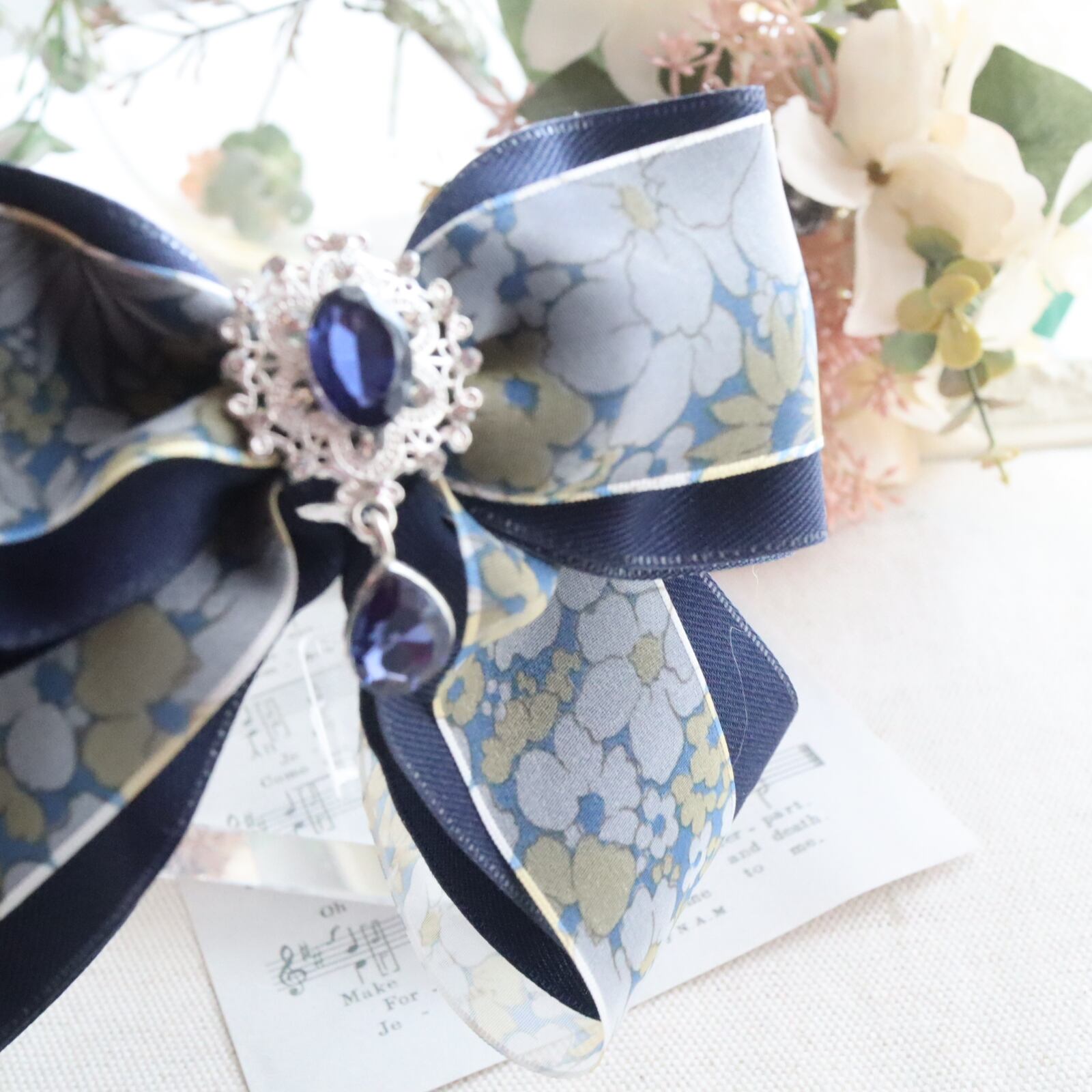 舞踏会にでも行けそうなキラキラミッドナイトブルーのビジューをあしらったおリボンです。